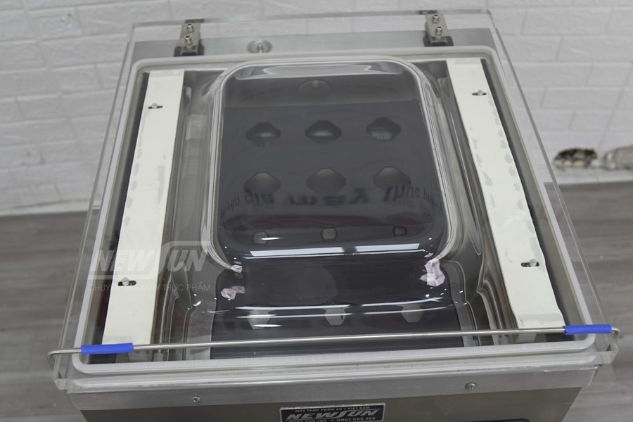 Nắp máy được làm từ mica nguyên tấm, độ trong suốt cao, cho phép quan sát rõ từng giai đoạn của chu trình hút chân không và ép miệng túi. Điều này giúp người dùng dễ dàng kiểm soát chất lượng đóng gói, kịp thời điều chỉnh nếu có sự cố như bọt khí, thực phẩm lệch vị trí hoặc mép túi bị cong.