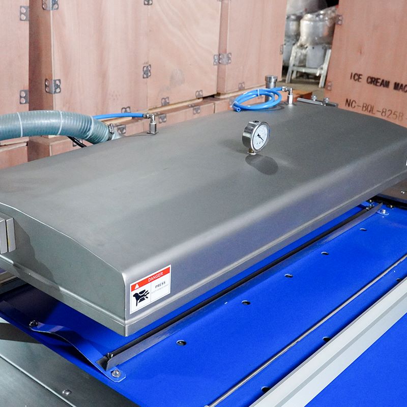 Băng tải PVC vận chuyển sản phẩm trơn tru, giữ túi đúng vị trí, hạn chế trượt hoặc lệch khi đưa vào buồng hút. Chiều cao băng tải có thể điều chỉnh phù hợp với túi lớn, túi nặng hoặc chứa thực phẩm dạng lỏng. Khi công nhân đặt túi lên băng tải, nắp buồng hút tự động đóng/mở bằng motor, giảm thao tác thủ công và đảm bảo quá trình hút chân không diễn ra liên tục, chính xác.